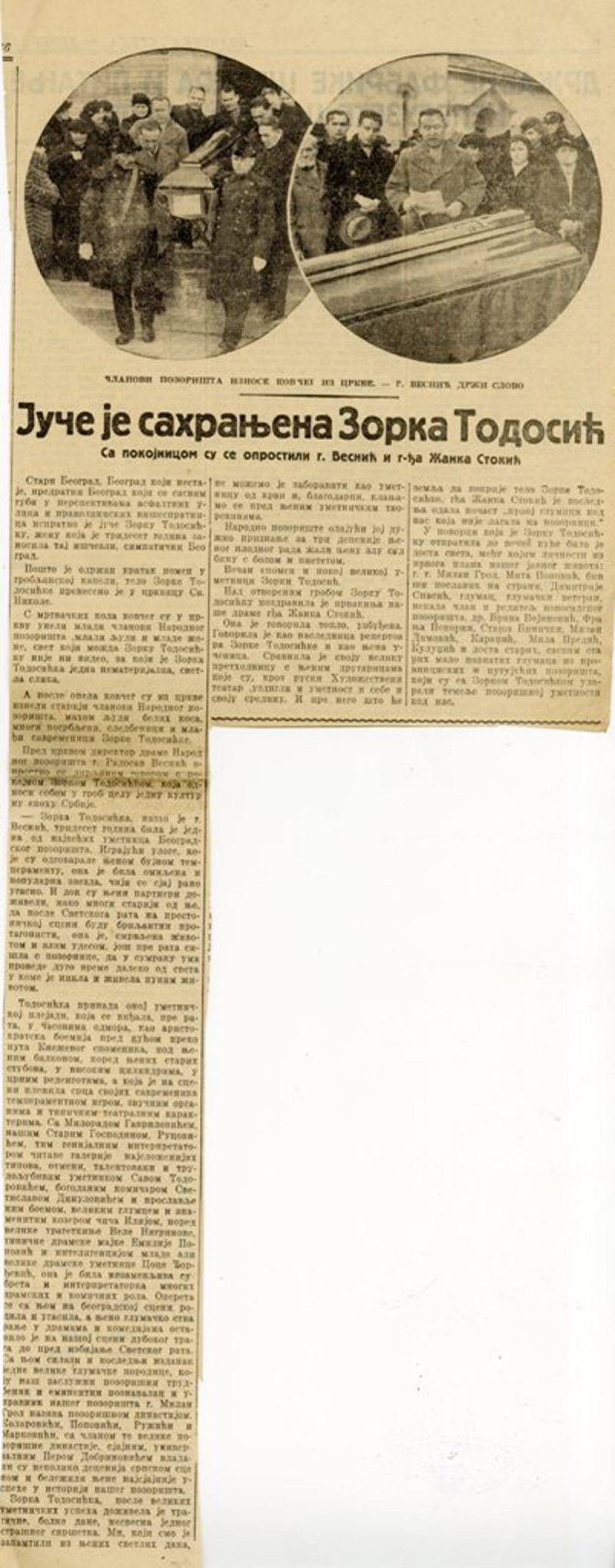 На њеној сахрани учествовао је велики број личности из уметничког света, неколико старих Београђана који памте славу велике глумице и доста старих, сасвим старих мало познатих глумаца из провинцијских и путујућих позоришта који су са Зорком ударали темеље позоришној уметности. У име београдског Народног позоришта, од Зорке Тодосићке опростили су се управник Војиновић , директор драме Радослав Веснић , редитељ Народног позоришта и књижевних Јосип Кулунџић , затим Милан Грол , управник Државне штампарије Момчило Милошевић, композитор Станислав Бинички , пуковник Драгутин Покорни, Мита Димитријевић , Мита Поповић . Од београдских глумаца и глумица били су Жанка Стокић , Марија Таборска , Теодора Арсеновићка , Зора Златковић, Гина Јовановић, затим Александар Туцаковић , представници Глумачке школе и многи други. Испред цркве, директор драме Народног позоришта Радослав Веснић опростио се дирљивим говором с покојном Зорком Тодосићком, која је “тридесет година била једна од највећих уметница београдског позоришта”. На самом гробљу са Зорком опростила се и првакиња драме Жанка Стокић. Као наследница репертоара Зорке Тодосићке и као њена ученица, говорила је топло и дирљиво: “…Ако је ико стварао традицију позоришта на нашој сцени, Зорка Тодосић није жалила ни свој дар ни своје моћи да глуми човечански, да не лаже о човеку и његовим страстима и идеалима и да ствара љубав за уметност глуме и код публике и код глумаца. Она је увек стварала тако да се, уживајући у њеним тумачењима, учило – а то је свакако највиши и најплеменитији задатак глумачког позива...”.