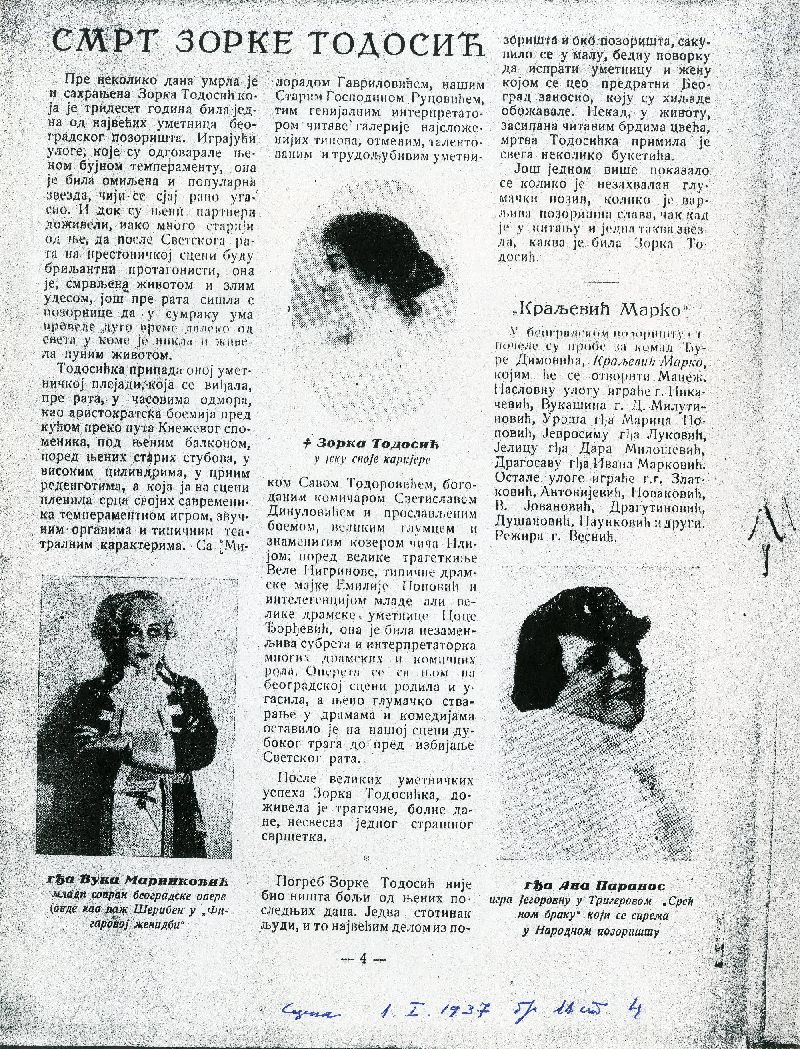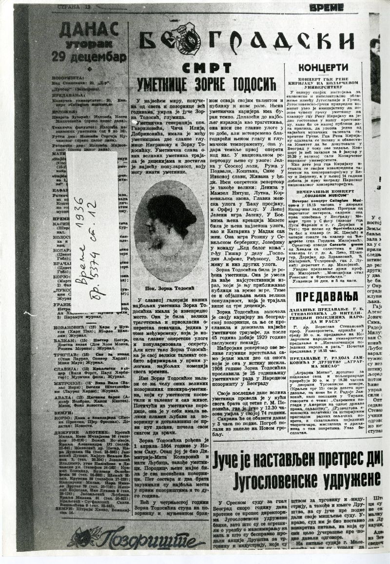 Међутим, у позоришном окружењу, “била је присутна предрасуда да се у неком жанровима, попут водвиља и оперете, не може тражити од глумаца она стваралачка индивидуалност и опредељеност за ново као у драми или трагедији”. Поред тога, познати садржаји комада и оперета били су упрошћени, а ликови шаблонизирани због чега је било тешко одговорити на нове захтеве времена. Ови поступци су правдани потребом да се задовољи пажња и интересовање публике. Глумци београдске сцене су тако били под сталним притиском јавности чији је једини циљ био да играју пред препуном двораном. Уверењима неких позоришних историчара, жртве таквих схватања биле су најпознатије субрете београдске сцене Марија Цветић и нарочито Зорка Тодосић. “Позориште их је свесно гурало према естради – користећи беспоштедно њихову младост, темпераменат, глас и способност комуникације са публиком. Позоришту су оне биле потребне и експлоатисане су чак и у оформљеном укусу. Биле су популарне – али су увек помало оспораване управо због улога које су тумачиле”. Као глумици која је идентификована са једним репертоаром, Зорка је истовремено искушавала свој таленат у другачијим комадима где га нико није очекивао.