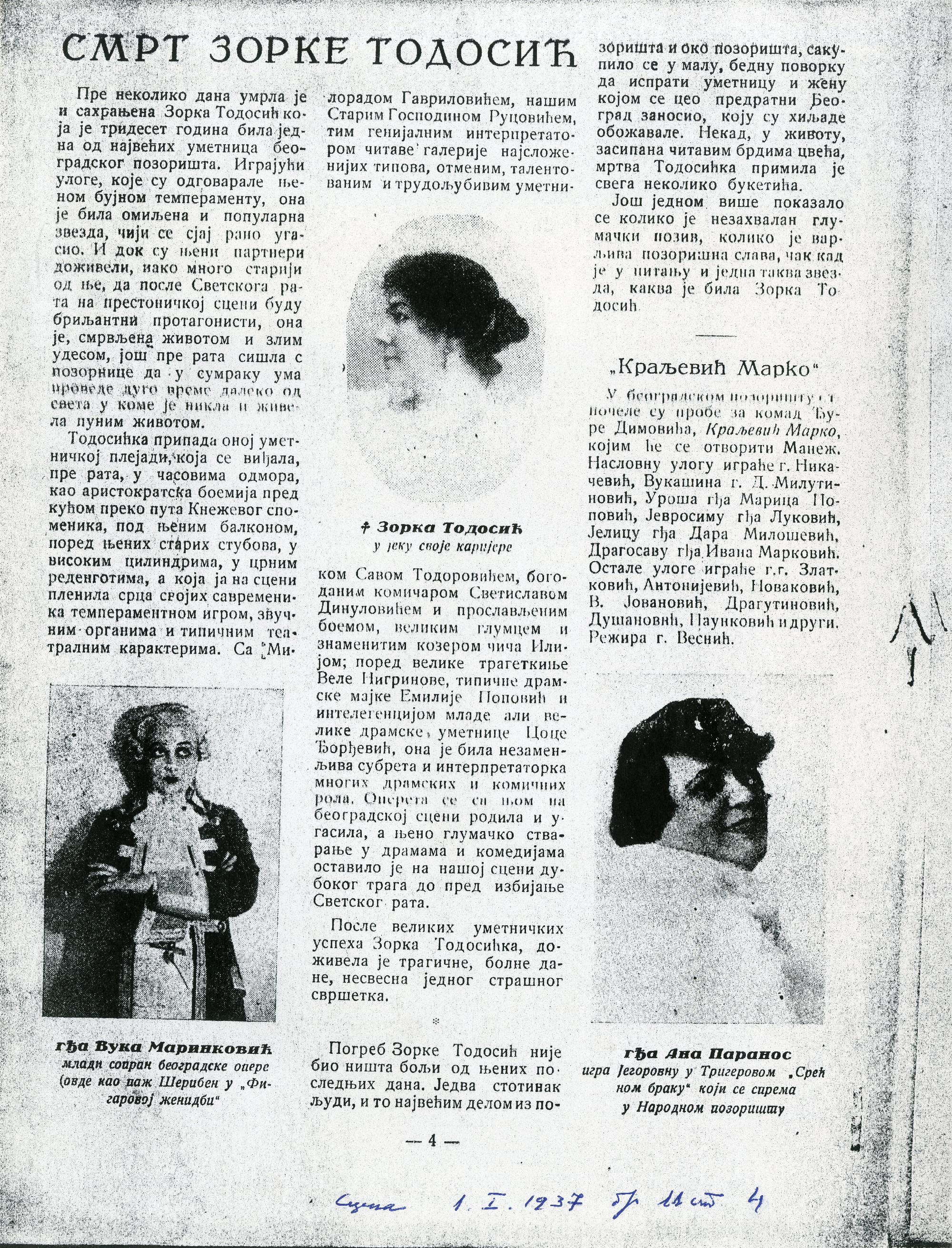 Према схваћеном карактеру улога с певањем, Зорки Тодосићки је додељена и прва Коштана. Међутим, прво извођење Коштане пратио је неуспех који се огледао кроз слабу посећеност представе, лоше критике и незадовољство самог писца. Затим, она је на својим плећима понела цео водвиљски и оперетски репертоар: Тата-Тото, Мамзел Нитуш, Христу поштарку у Птичару, Маскоту, Лепу Јелену, Мимозу у Гејши, Аделу у Слепом мишу и многе друге.